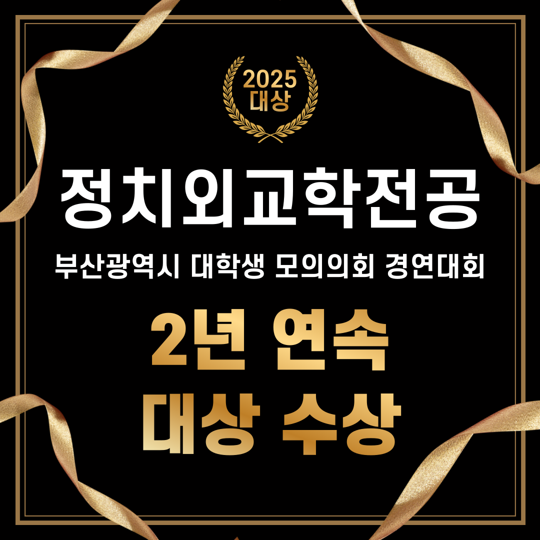 메인으로 이동 SNS 목록열기 FACEBOOK 공유하기 TWITTER 공유하기 BLOG 공유하기 SNS 목록닫기 인쇄 url 복사 모의의회 대상수상 동아대학교 정치외교학전공부산광역시 대학생 모의의회 경연대회 2년 연속 대상 수상 메인비주얼 동아대학교 정치외교학전공"국제 무대에서 빛나는 리더, 정치학도의 길을 걸어보세요" 이전 장면 1 다음 장면 정지 재생 팝업존 1 이전 장면 정지 재생 다음 장면 학사일정 교과과정 학과소개포털 캠퍼스맵 취업정보 동아대학교 도서관 교수소개 장학안내 새로운 소식 공지사항 더보기 졸업공지 더보기 장학공지 더보기 학과소개 Department of Political Science and Diplomacy 학과소개 바로가기 학과 유튜브 이전 장면 다음 장면 학과인스타그램